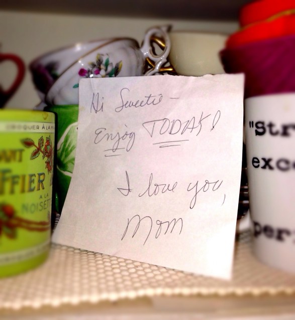 While working to collect some of Mom’s best advice from bloggers for a client earlier in the week, I was thinking about all the things my mom has shared with me over the years… And, I remembered this note I found in my kitchen cabinets after she had spent a few days with me about five or six years ago. It said, “Enjoy today… I love you, Mom.”