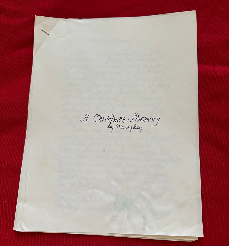 Within seconds, I realized I was holding a time capsule – an essay I wrote in 1985. Ironically, this is the same year Back to the Future was released in theaters, but that’s where the similarities end. I could see traces of the first page through the cover sheet. I had scrawled what looked like a rudimentary attempt at calligraphy, announcing it as, simply, “A Christmas Memory.”