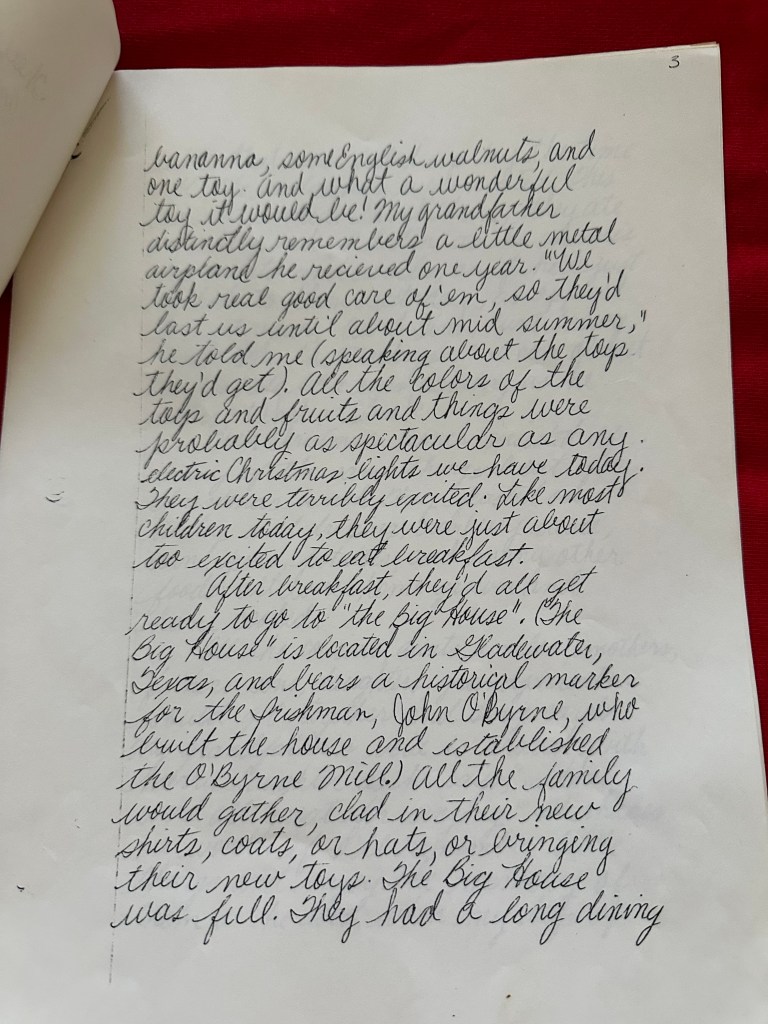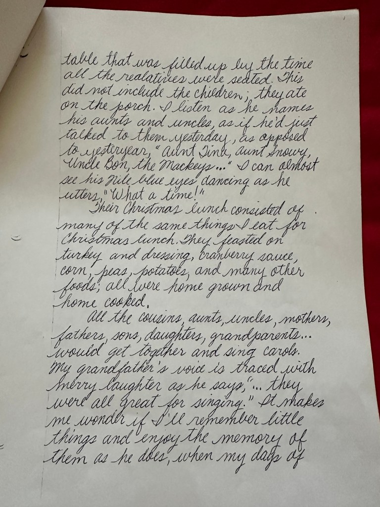 A phantom cramp hit my hand as I remembered how I had to write – and rewrite and rewrite – stories for school (before typed assignments were the norm). But, the delicate dance of my childhood voice with my grandfather’s captivated me. It traveled through descriptions of Christmases long before my parents were born – and what they meant to my grandfather as a boy. And, it turned, dipped and twisted through the mind of the smaller, younger, wide-eyed person I used to be.